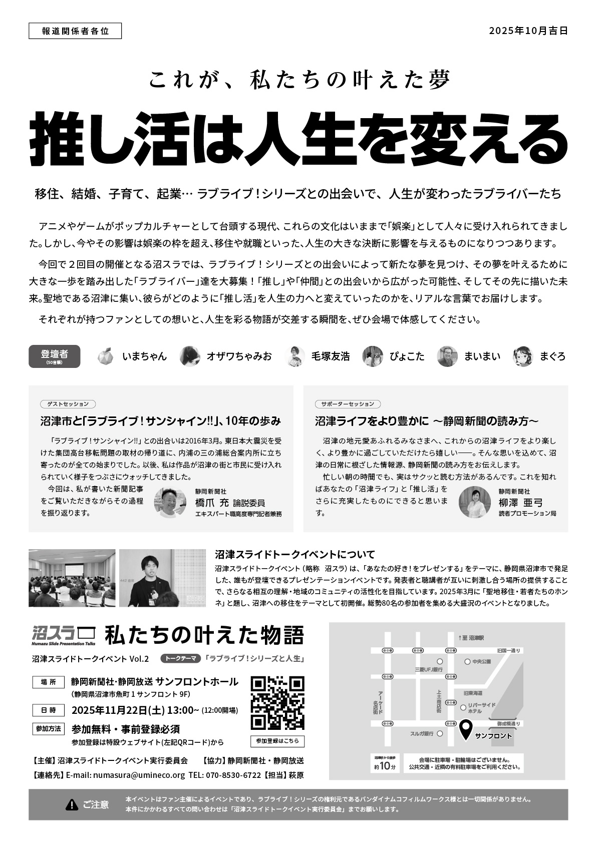 本イベントはファン主催によるイベントであり、ラブライブ!シリーズの権利元であるバンダイナムコフィルムワークス様とは一切関係がありません。本件にかかわるすべての問い合わせは「沼津スライドトークイベント実行委員会」までお願いします。